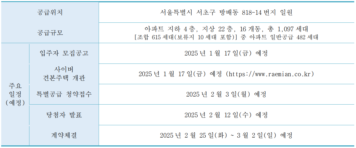서울시 서초구 방배동 818-14번지 일원에 지하 4층부터 지상 22층 16개 동 규모로 총 1,097세대가 2025년 11월 입주하는 래미안 원패를라 아파트 특별공급 분양정보입니다. 서초구 방배동 래미안 원패를라 아파트 입주자모집공고는 2025년 1월 17일 금요일 예정되어 있습니다. 기관추천 특별공급 입주자에 대해서는 사전에 공지 후 특별공급 일정에 청약접수를 받고 있습니다.