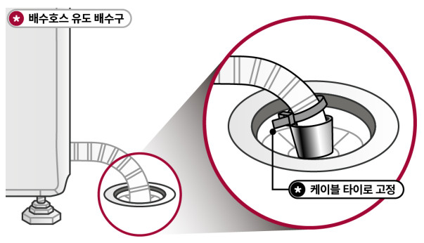 세탁기 헹굼 또는 탈수를 하면서 배수 중 하수구 물참에 의해 배수호스가 물에 잠기는 현상 방지를 위해 배수호스 끝단 고무부위만 배수구에 들어갈 정도로 삽입 후 케이블타이로 고정해주세요. 조치 후에 배수행정에서 배수호스가 물에 잠기는지 확인이 필요하며 하수구가 이물질에 막혀있다면 배수가 잘 되도록 청소해 주세요.