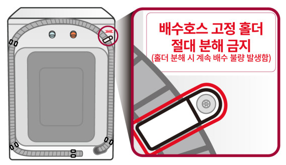 세탁기 뒷면 배수호스 고정부를 분리한 경우에도 IE에러코드가 발생 할 수 있습니다. 배수호스 연장을 위해 임의로 고정홀더 제거하는 경우가 있는데 배수호스 길이가 부족한 경우 연장배수호스를 이용하여 길이 연장을 해야 합니다. 배수호스 고정 홀더를 제거할 경우 배수호스의 높이가 드럼 내 물의 높이보다 낮아져서 물이 자연적으로 배수되어 급수가 진행되더라도 물이 채워지지 않아 IE에러가 발생합니다.