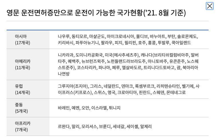 영문운전면허증을 인정해 주는 국가에서 운전할 때 별도의 번역공증서 없이 운전이 가능하지만 일부 국가별 상황에 따라 추가서류를 요구할 수도 있습니다. 영문운전면허증을 인정해주지 않는 국가에서는 국제운전면허증, 여권 등이 필요하므로 꼭 소지하고 운전해야겠습니다.