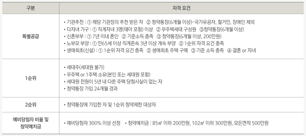 특별공급 신청은 꼭 세대주가 아니어도 청약이 가능한데 기관추천, 신혼부부, 다자녀 특별공급은 세대원도 청약이 가능합니다. 하지만 노부모, 생애최초 특별공급은 세대주만 신청 가능합니다.