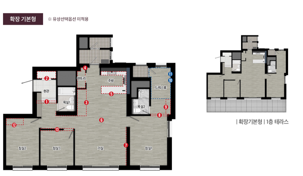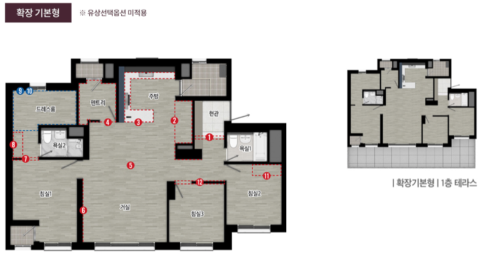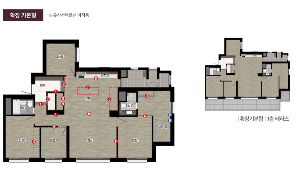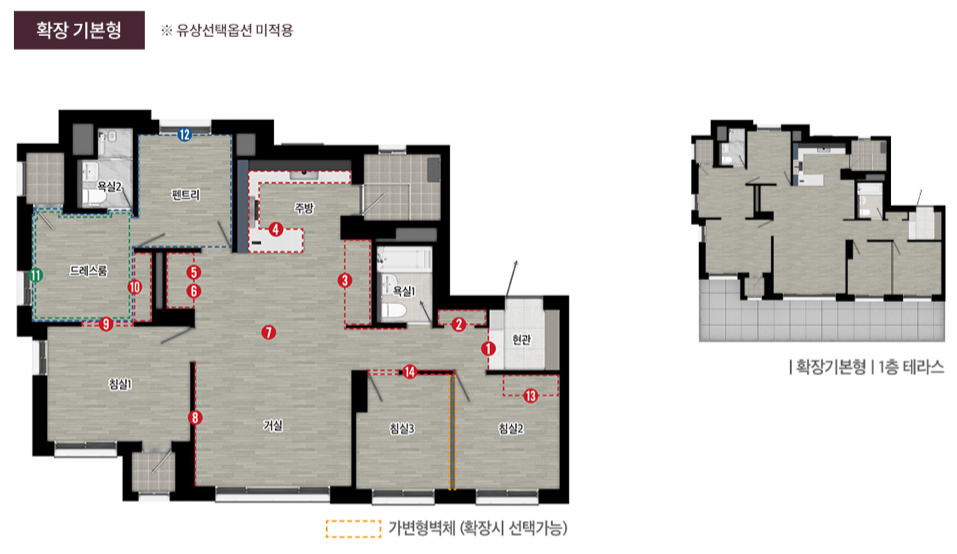 일부세대의 경우 1층 테라스, 3면 발코니가 적용되었습니다