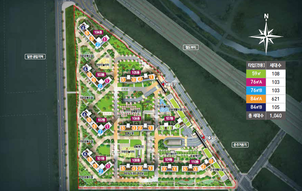 남향 위주 단지 배치와 4 Bay 설계(일부 제외)를 적용되었습니다. 또한 실수요자 선호도가 높은 59·76·84㎡ 중소형 평형의 대단지 아파트로 조성되었으며, 실내 골프연습장, 피트니스센터, 작은 도서관, 독서실, 다목적체육관 등 삶의 품격을 높여주는 각종 커뮤니티 시설도 들어섭니다. 또한, 세대 외부에서 생활가전 원격 제어 등이 가능한 스마트 IoT 시스템도 도입되었습니다.