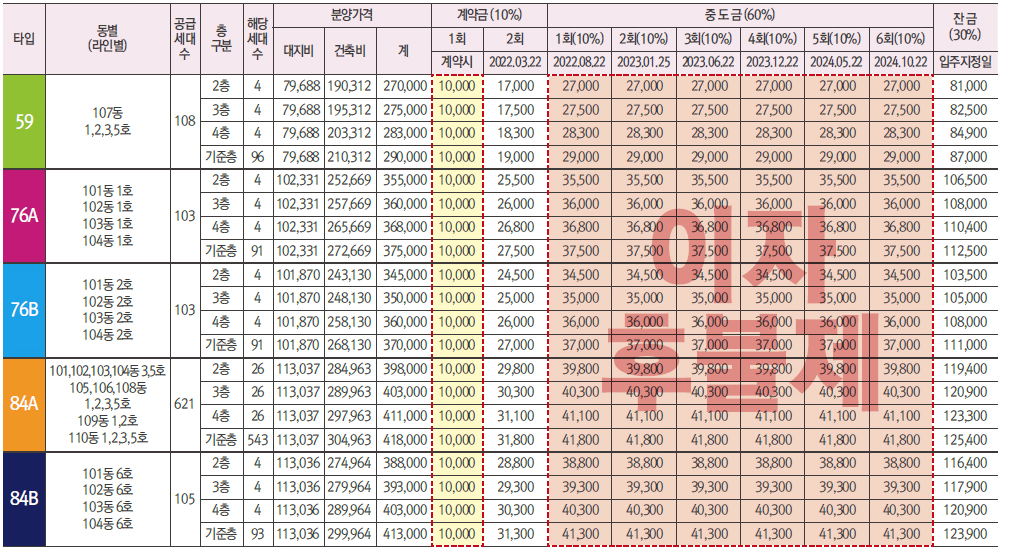 분양가는 최소 59㎡ 2층 2억 7천만 원부터 최고 84㎡ A타입 기준층 4억 1,800만 원으로 평당가는 1,241만 원/3.3㎡입니다.