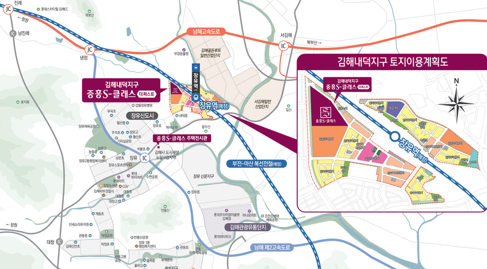 단지에서 부전~마산 복선전철' 장유역이 도보권으로 편리하게 이동할 수 있습니다. 부산~김해~마산을 잇는 노선으로 장유역 이용 시 부산 부전역까지 이동시간은 기존 1시간 53분에서 약 30분대로 대폭 감소할 전망입니다. 여기에 단지 인근 장유 여객터미널이 올해 하반기 착공 예정이며, 남해고속도로와 남해 제2고속도로가 인접해 차량을 통한 시내·외 이동도 수월합니다.
