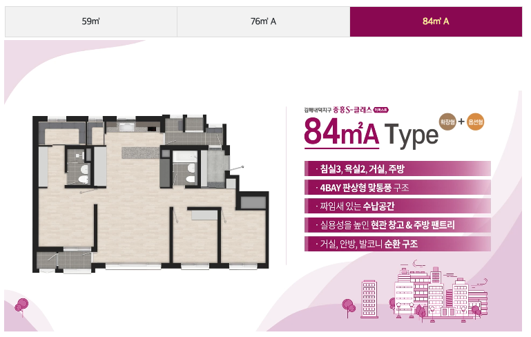 모델하우스에는 59, 76A, 84A 타입의 주택형이 설치되어 있으며, 76B, 84B 타입의 주택형은 견본주택에 설치되어 있지 않으므로, 청약신청 시 공급 안내문에 표기된 타입별 형태를 반드시 확인하셔야 합니다. 사이버 견본주택에는 59, 76A, 84A 타입(VR)이 게시되어 있으니 참고하시면 되겠습니다.