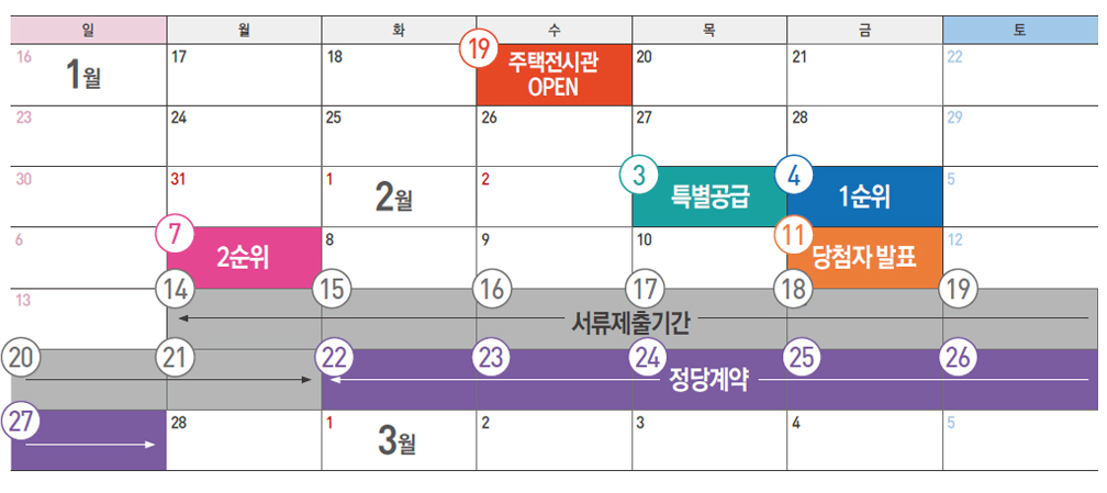 2월 3일 특별공급을 시작으로 4일 1순위에 이어 7일 2순위 청약접수 순으로 분양된다. 당첨자 발표는 2월 11일이며, 정당계약은 22일부터 27일까지 진행됩니다.