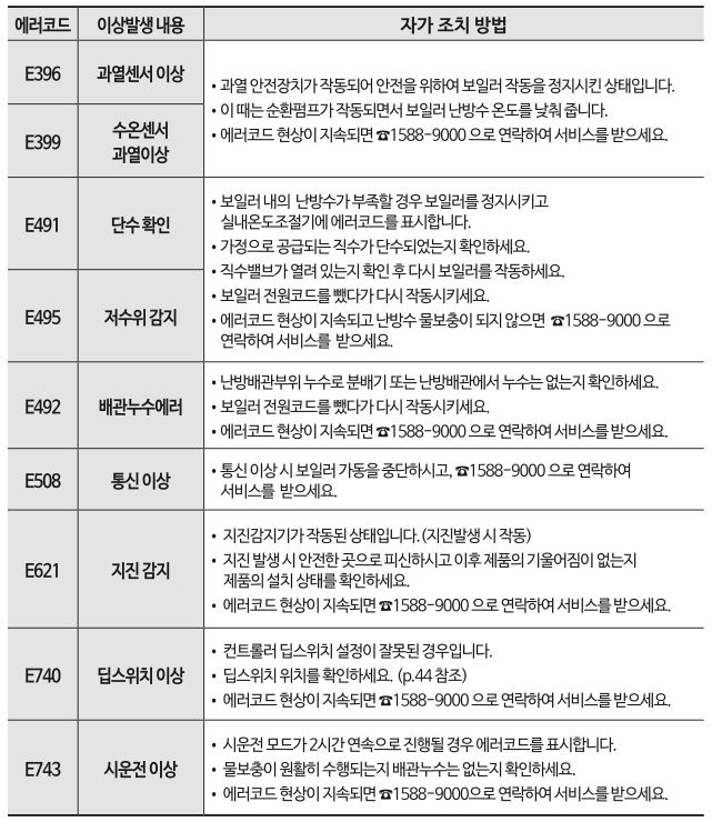 상황별 발생하는 보일러 에러코드 및 이상현상은 자가조치가 되는 증상도 있지만 보일러 시공업체 및 보일러 전문인의 서비스가 필요한 경우가 있으므로 상황별 발생하는 에러코드 고장원인을 확인하신 후 서비스센터 조치가 필요한 경우에는 빠른 출장점검을 요청해 점검을 받으셔야 합니다.