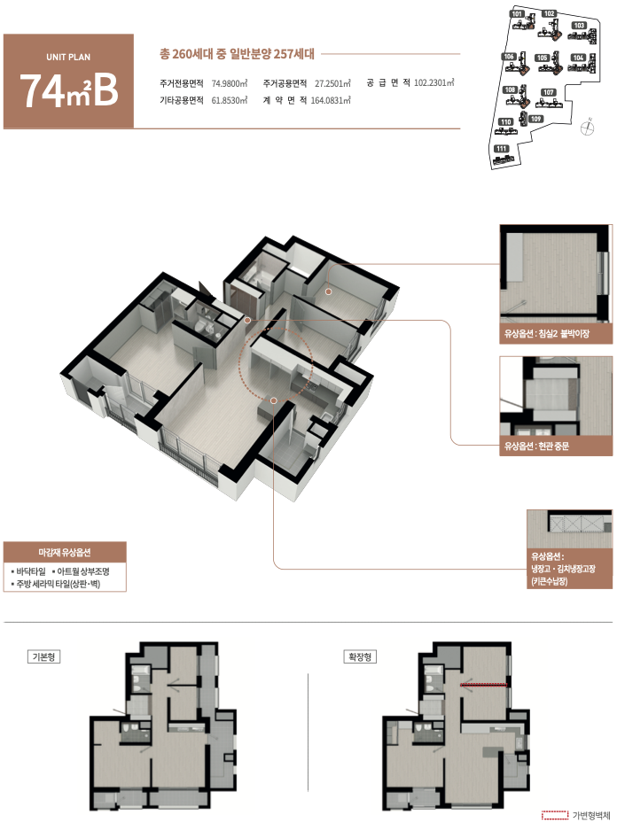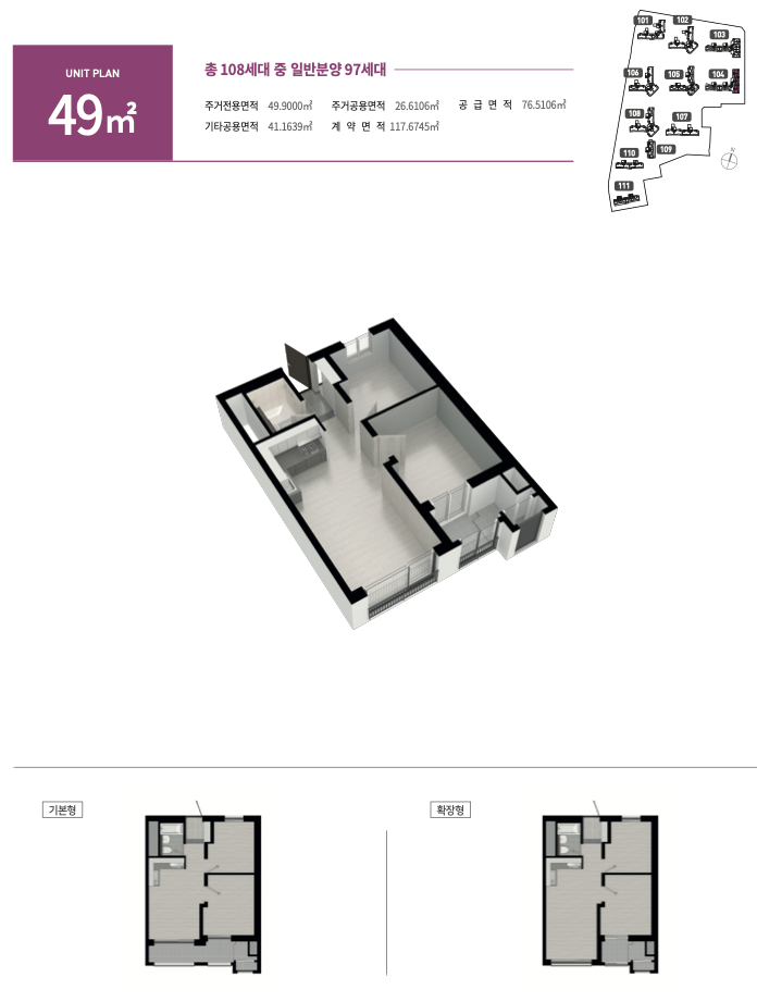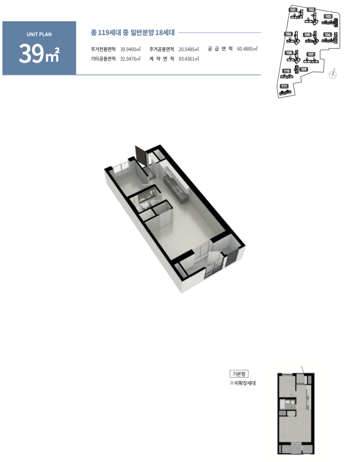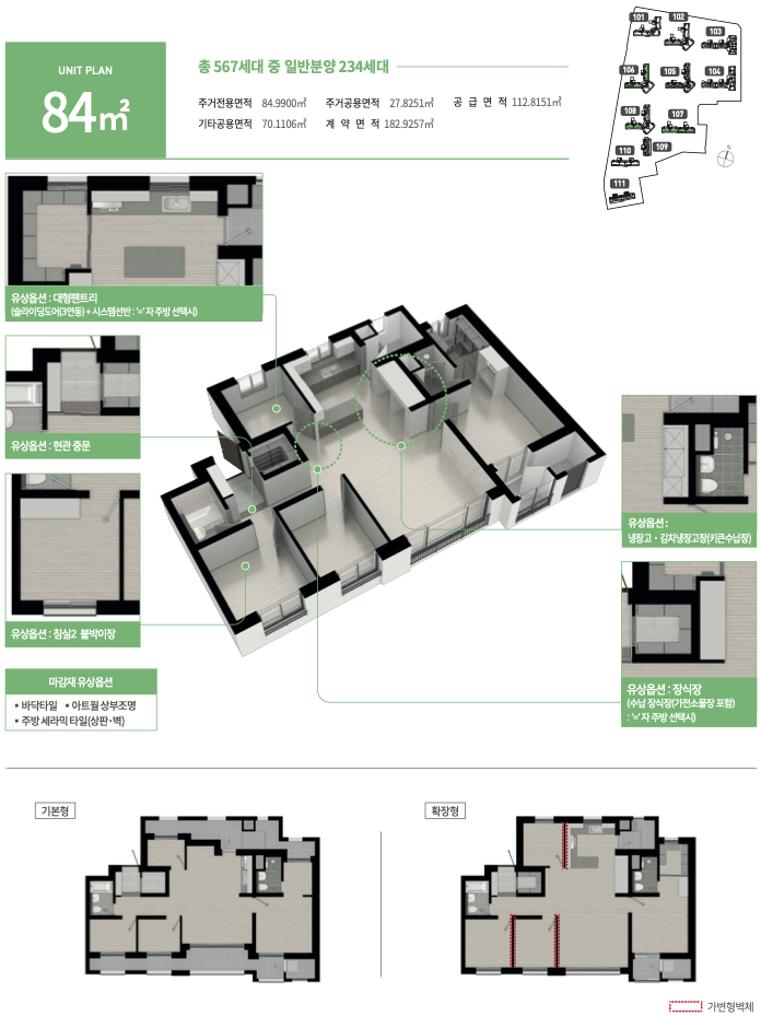 판상형, 탑상형 설계로 라이프스타일에 따라 선택할 수 있는 다양한 평면설계가 적용되었으며, 입주민 선호도에 따른 다양한 타입으로 39㎡부터 84㎡까지 다양한 타입으로 구성되었습니다.