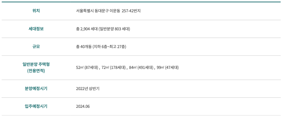 위치 및 공급규모는 서울 동대문구 이문동 257-42 일대에 지하 6층부터 최고 27층 높이로 40개동 규모가 공급되며 총 2,094세대가 2024년 6월 입주예정입니다.