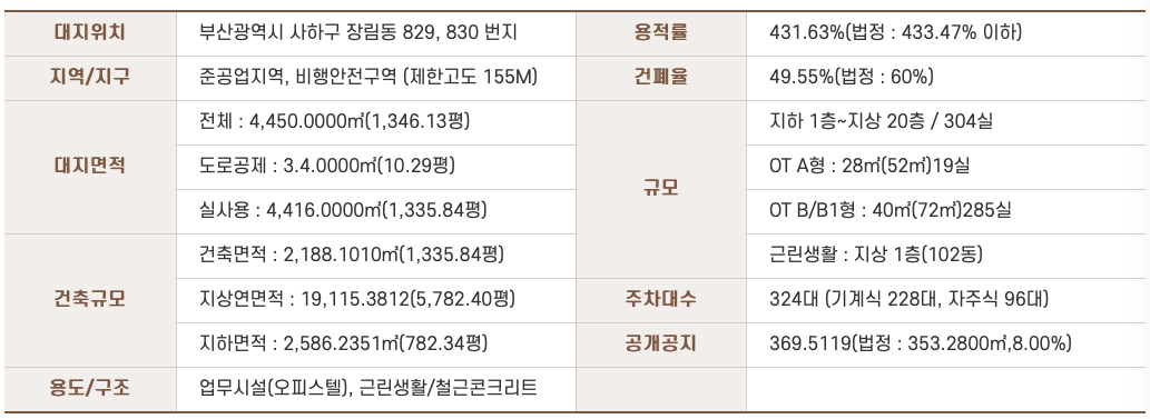 오피스텔 위치는 부산 사하구 장림동 829, 830번지에 지하 1층부터 지상 20층 높이 2개 동으로