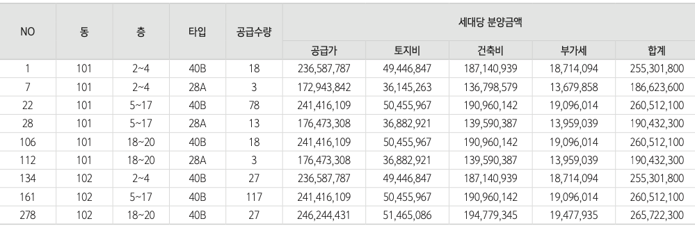 28A타입 최소 1억 8,662만 원부터 최대 1억 9,043만 원까지