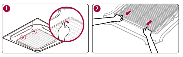 1. 천장형 에어컨은 흡입 그릴 가장자리 부위 후크를 안쪽으로 밀어주면 그릴이 에어컨 본체에서 분리됩니다. 그릴에 필터가 장착되어 있으므로 떨어지지 않도록 조심해서 내린 후 승강 그릴이 장착된 경우 승강 그릴이 완전히 멈추었는지 확인 후 필터를 그릴에서 안전하게 빼내주세요.