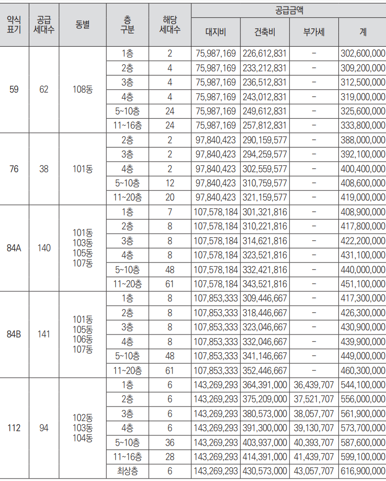 최소 3억 260만 원 (59 타입 108동 1층)부터 최대 6억 1,690만 원(112 타입 102동, 103동, 104동 최상층)으로 평당가 1,352만 원입니다.