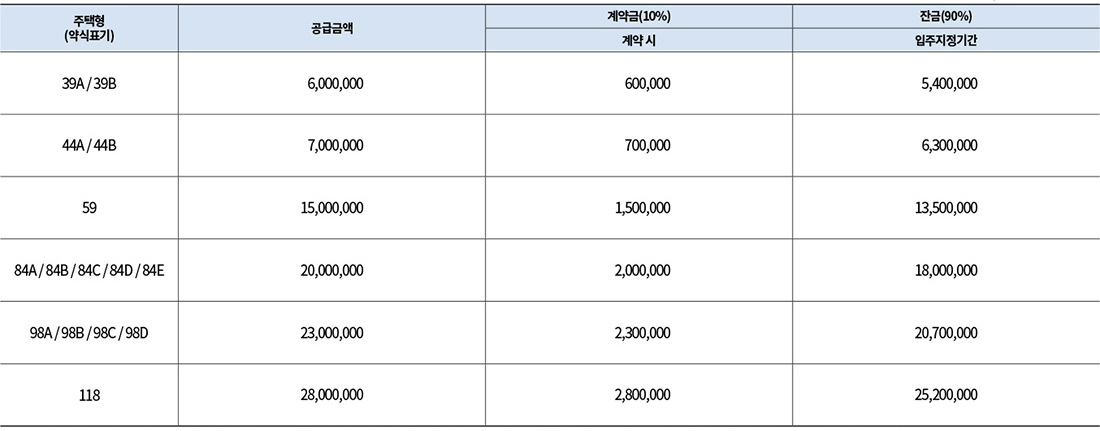 더샵 퍼스트월드 주택형이 39A 타입부터 118 타입까지 다양하게 공급되므로 자세한 공급금액은 다음 표를 참고하세요.