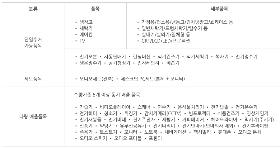 냉장고, 세탁기, 에어컨, TV, 전기오븐과 같이 하나만 신청해도 수거가 가능한 단일수거가능품목과 오디오세트, 컴퓨터와 모니터 등 세트품목 그리고 5개 이상 동시 배출만 신청이 가능한 가습기, 전기히터, 청소기 등 소형가전으로 나눠집니다.