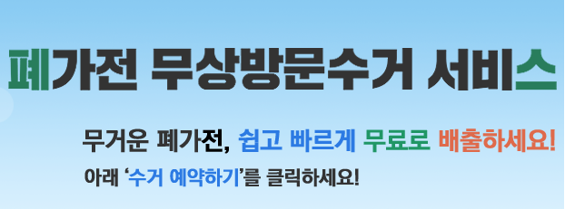 많은 분들이 모르는 폐가전 무료수거서비스. TV, 세탁기, 냉장고, 에어컨, 전자레인지 등 고장 나거나 오래되어 버려야 되는 전자제품들 돈 주고 폐기물 스티커 붙여서 버리는데 폐가전제품 무상방문수거 서비스를 이용하면 수수료를 낼 필요도 없고, 운반하지 않아도 되고 수거기사가 직접 방문해서 폐가전 제품을 수거해갑니다.