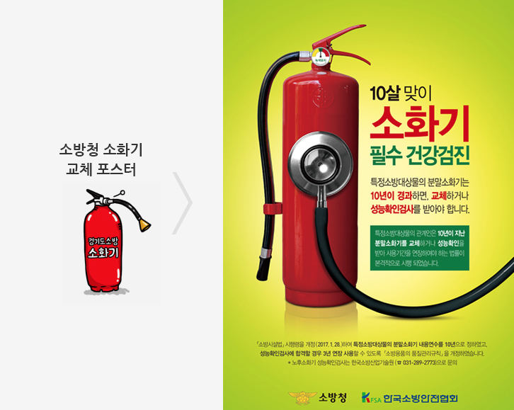 소화기 자체의 사용기한이 정해져 있기 때문에 기본적으로 소화기에 붙어있는 라벨을 확인하면 되지만 2017년 1월 28일부터 10년이 지나는 특정 소방대상물의 분말 소화기는 교체하거나 성능검사를 받도록 소방시설법이 개정되었습니다. 특정 소방대상물의 관계인은 내용연수가 경과한 소화기를 보유하고 있는 경우 1년이 되는 날이 되는 날까지 소화기를 교체하거나 성능검사를 받아서 합격할 경우 3년 연장 사용할 수 있습니다.