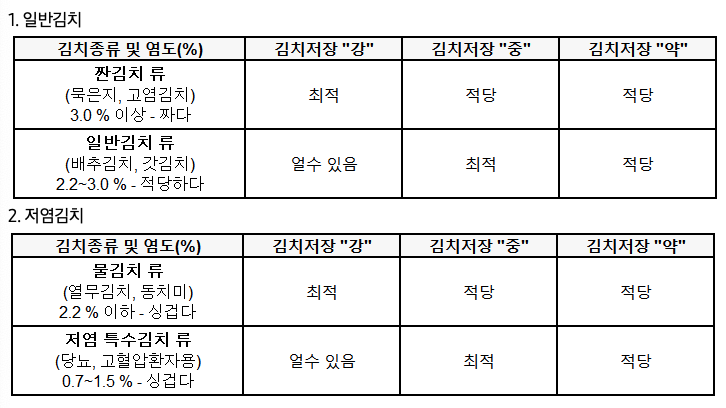 묵은지, 고염김치와 같은 짠김치 류는 김치저장 "강"으로 설정하고 배추김치와 갓김치류는 "중"으로 설정