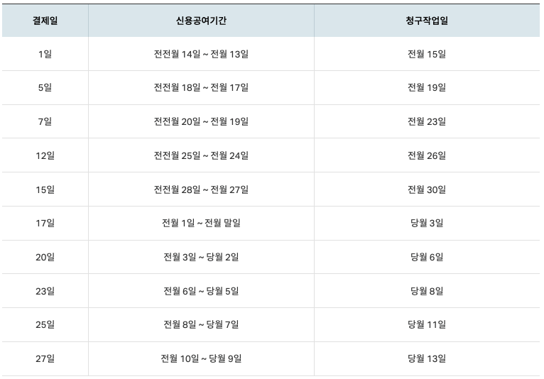 개인적으로 카드를 사용하면서 가장 좋아하는 결제일은 전 달 1일부터 말일까지 카드 사용하고 결제하는 일정인데 대부분의 카드가 그렇듯 13일이 카드결제일로는 무난할 거 같습니다.