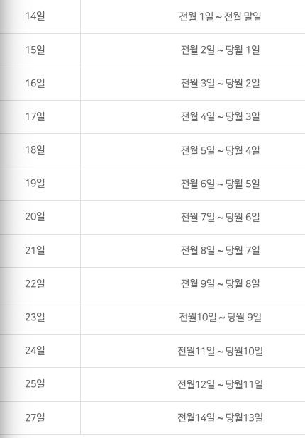 저처럼 전달 이용금액을 다음달에 결제하고 싶다면 14일이 좋은거 같습니다.